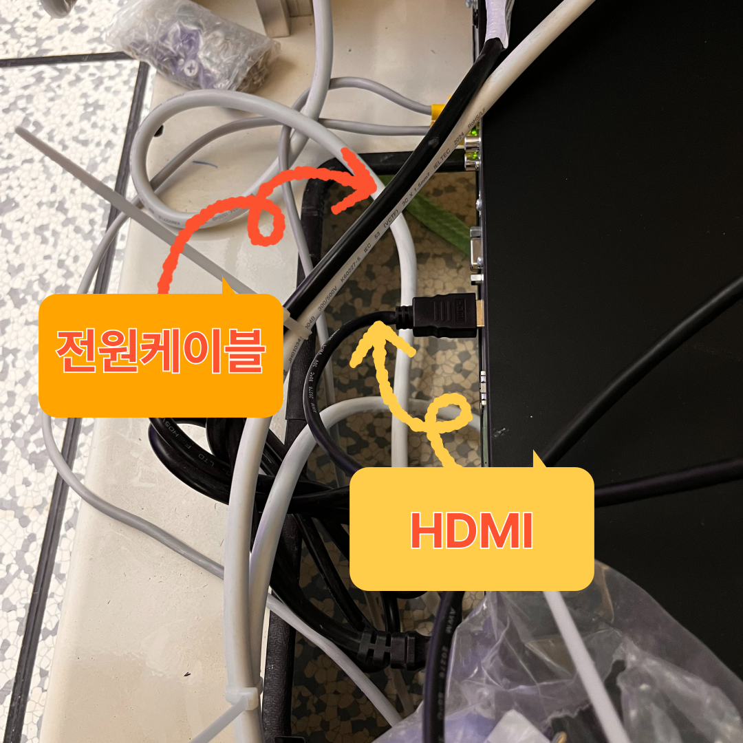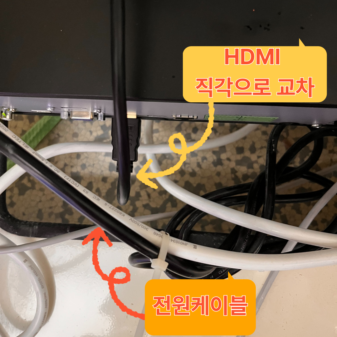 - 문제 상황: 전원선과 HDMI 케이블이 나란히 붙어 케이블 타이로 묶여 있었음