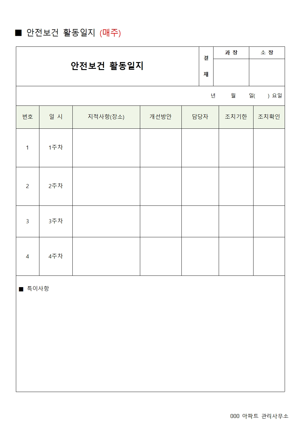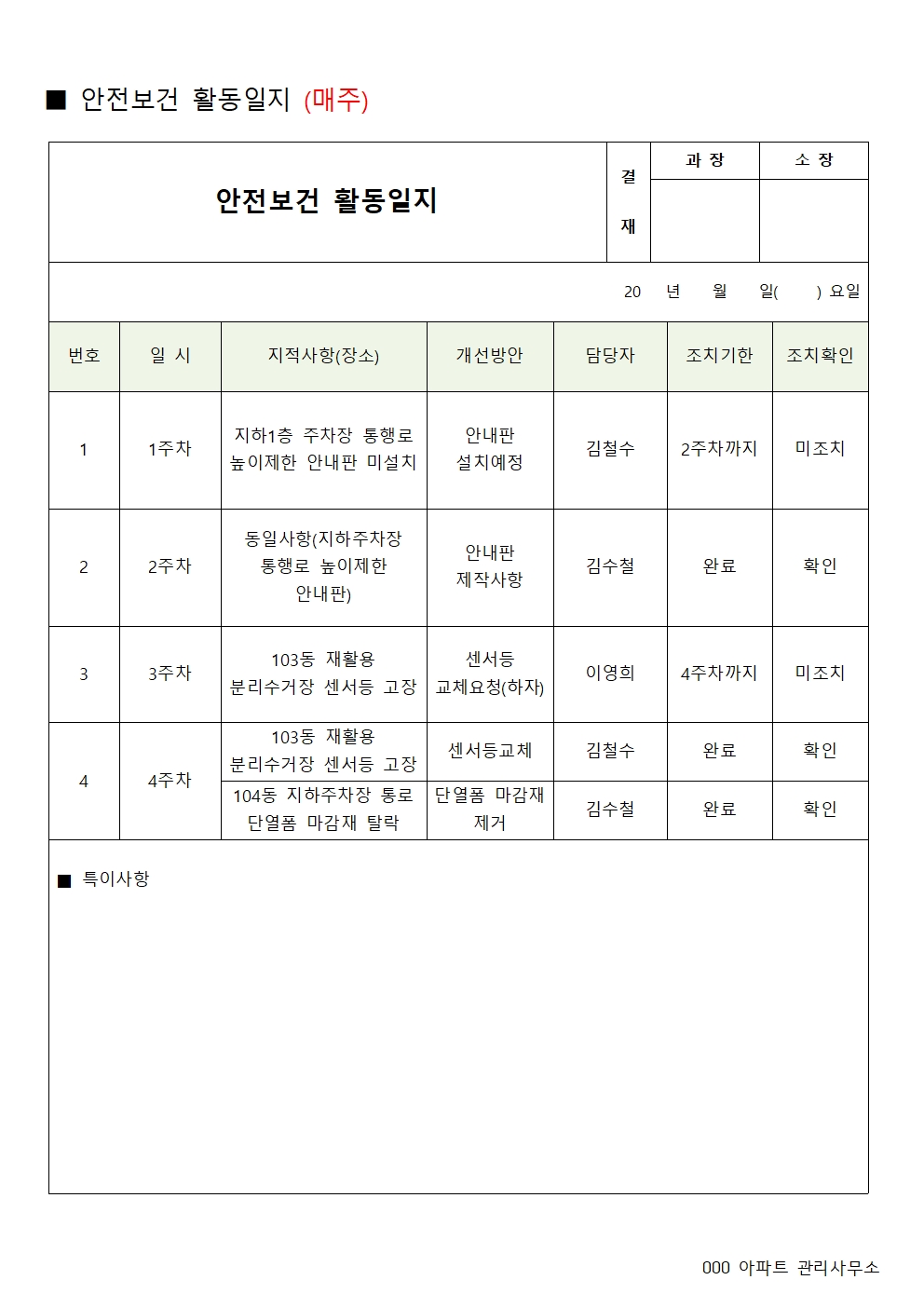 | 주 1회 | 안전보건 활동일지 | 단지 내 위험 요소 발견 | 활동일지 |
