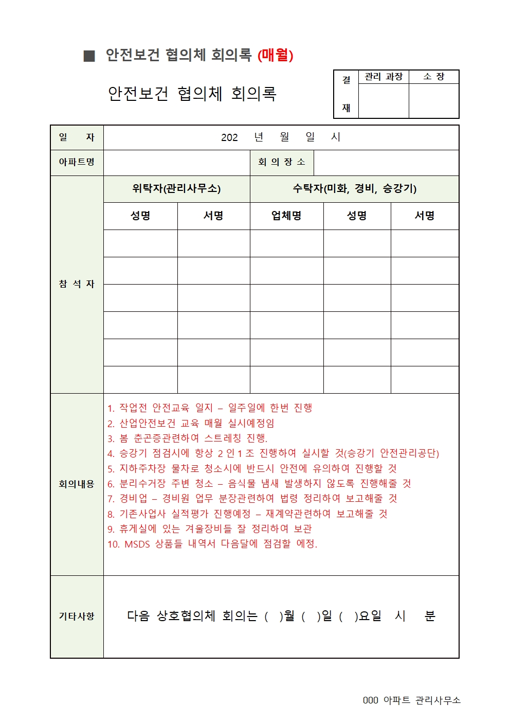 | 월 1회 | 안전보건 협의체 | 큰 위험요인·정책 공유 | 회의록 + 참석자 사진 |