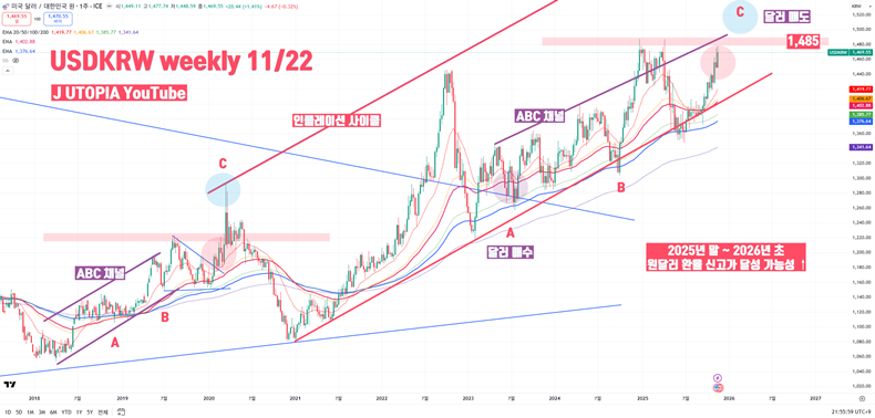 - 2025년 11월 말 기준 원·달러 환율은 1460~1480원까지 올라왔습니다. (Trading Economics)